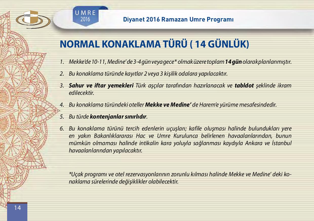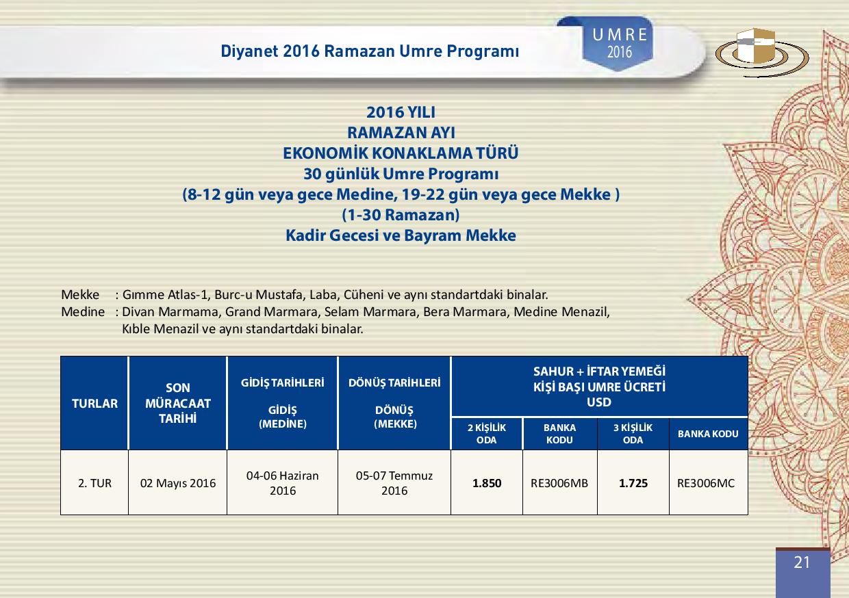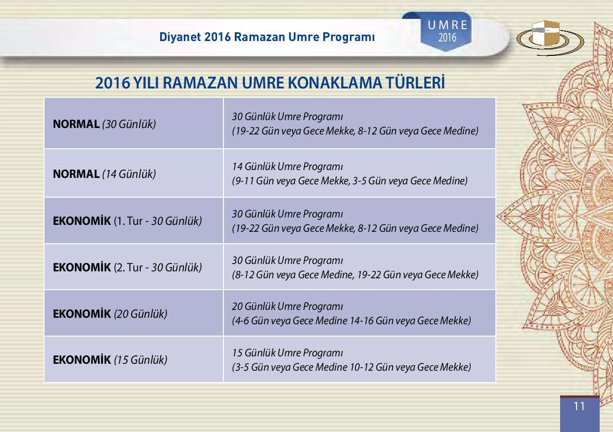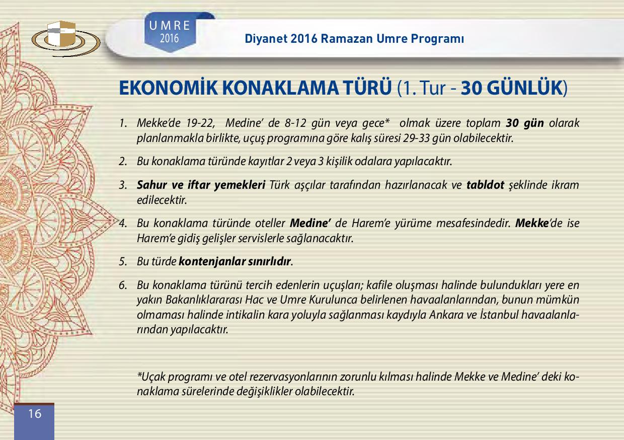2016 yılı Ramazan ayı umre organizasyonunda planlanan umre turlarının özellikleri, broşürde tablolar halinde belirtilmiştir.