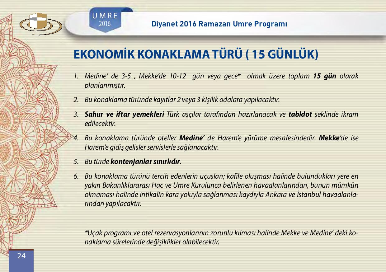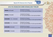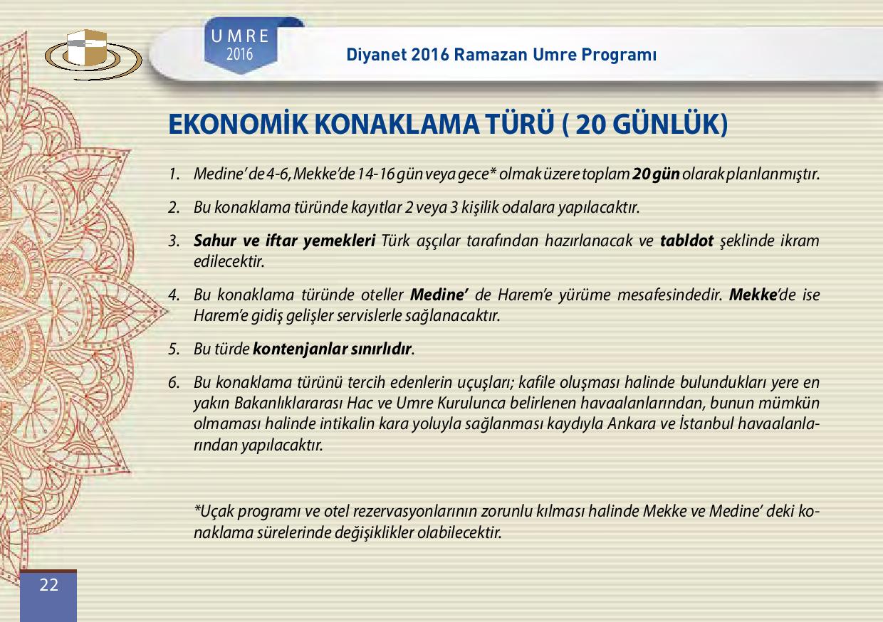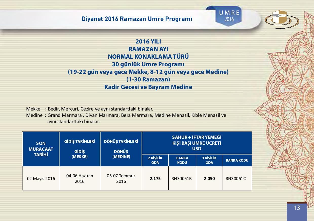 2016 yılı Ramazan ayı umre organizasyonunda planlanan umre turlarının özellikleri, broşürde tablolar halinde belirtilmiştir.