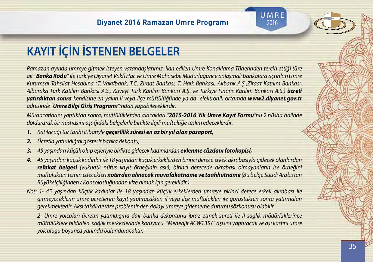 Ramazan ayında umreye gitmek isteyen vatandaşlarımız, ilan edilen Umre Konaklama Türlerinden tercih ettiği türe ait “Banka Kodu” ile Türkiye Diyanet Vakfı Hac ve Umre Muhasebe Müdürlüğünce anlaşmalı bankalara açtırılan Umre Kurumsal Tahsilat Hesabına (T. Vakıfbank, T.C. Ziraat Bankası, T. Halk Bankası, Akbank A.Ş.,Ziraat Katılım Bankası, Albaraka Türk Katılım Bankası A.Ş., Kuveyt Türk Katılım Bankası A.Ş. ve Türkiye Finans Katılım Bankası A.Ş.) ücreti yatırdıktan sonra kendisine en yakın il veya ilçe müftülüğünde ya da elektronik ortamda www2.diyanet.gov.tr adresinde “Umre Bilgi Giriş Programı”ından yapabileceklerdir. Müraacatlarını yaptıktan sonra, müftülüklerden alacakları “2015-2016 Yılı Umre Kayıt Formu”nu 2 nüsha halinde doldurarak bir nüshasını aşağıdaki belgelerle birlikte ilgili müftülüğe teslim edeceklerdir.